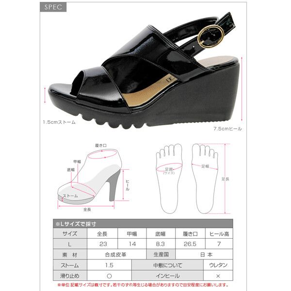 | 適応サイズ S:22.5〜23.0cm M:23.0〜23.5cm L:23.5〜24.0cm LL:24.0〜24.5cm ヒールの高さ:約7cm 前底の高さ:約1.5cm |