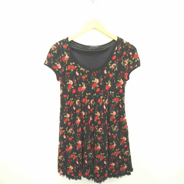 【中古】マーキュリーデュオ ワンピース ニット ひざ丈 花柄 フレア 丸首 フレア レース 半袖 F ブラック レッド 黒
