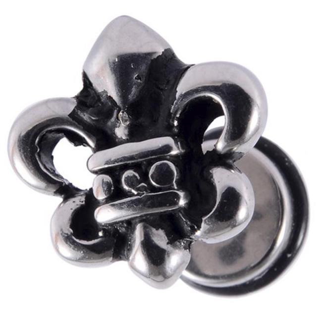 フランスの王家の紋章、百合の紋章をデザインした16ゲージのストレートバーベルにゴムキャッチ付きのフェイクボディピアスパーツをセットした装着するとまるでプラグ型のボディーピアスを付けているように見えるおしゃれなアイテム。