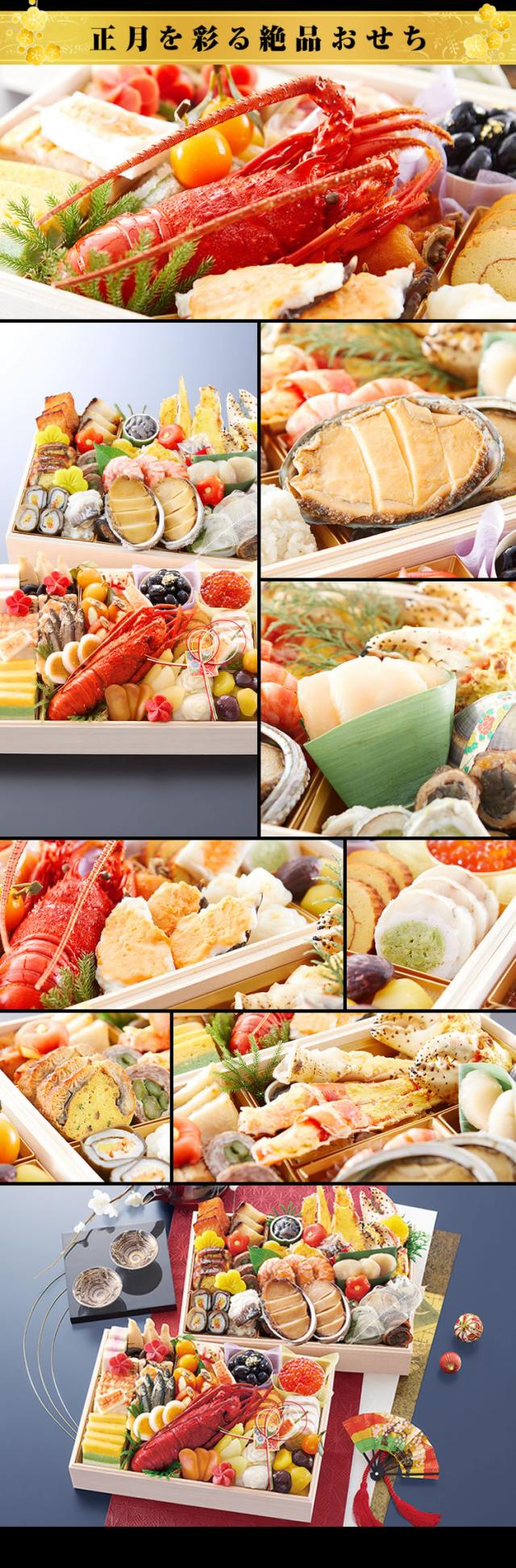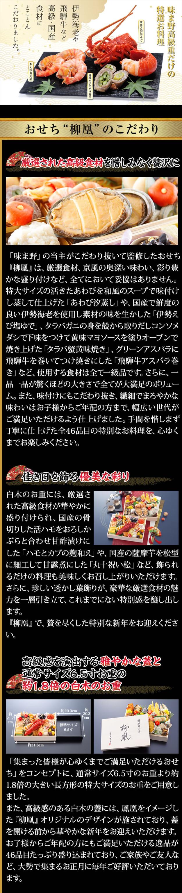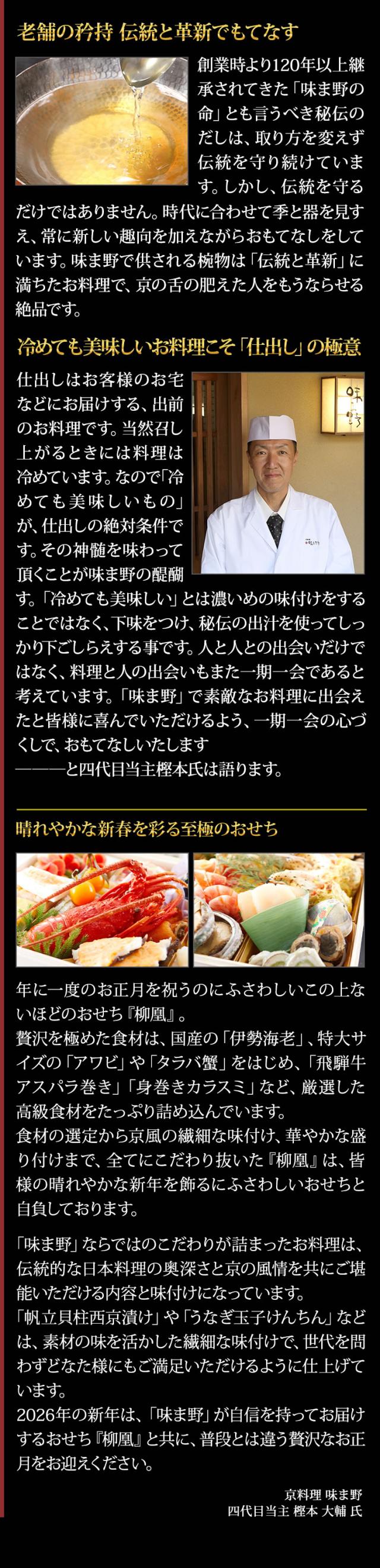 年に一度のお正月を祝うのにふさわしいこの上ないほどのおせち『柳凰』。贅沢を極めた食材は、国産の「伊勢海老」、特大サイズの「アワビ」や「タラバ蟹」をはじめ、「飛騨牛アスパラ巻き」「身巻きカラスミ」など、厳選した高級食材をたっぷり詰め込んでいます。食材の選定から京風の繊細な味付け、華やかな盛り付けまで、全てにこだわり抜いた『柳凰』は、皆様の晴れやかな新年を飾るにふさわしいおせちと自負しております。
