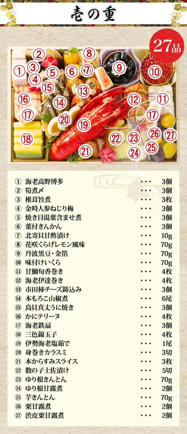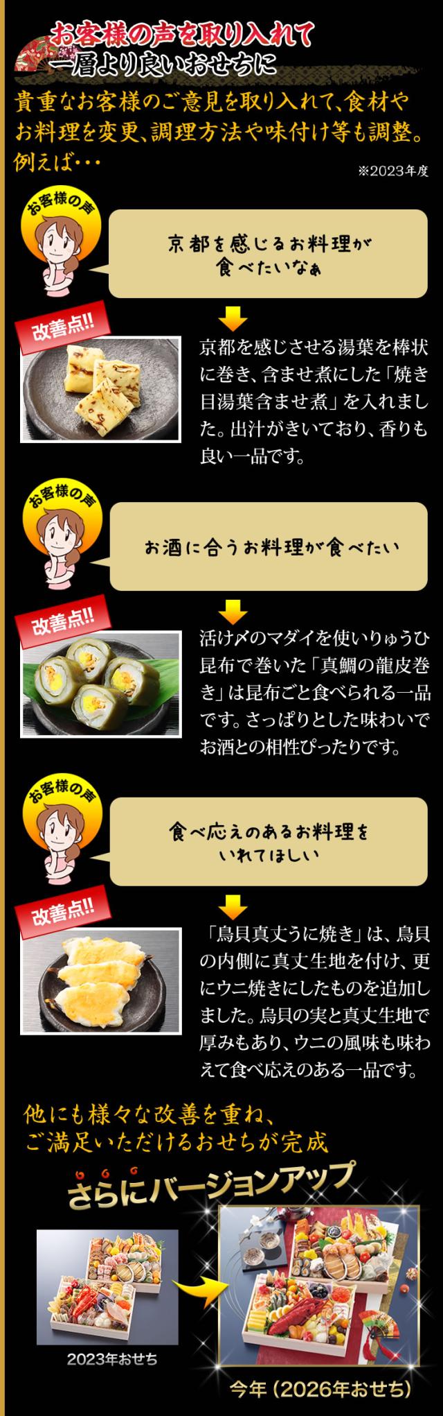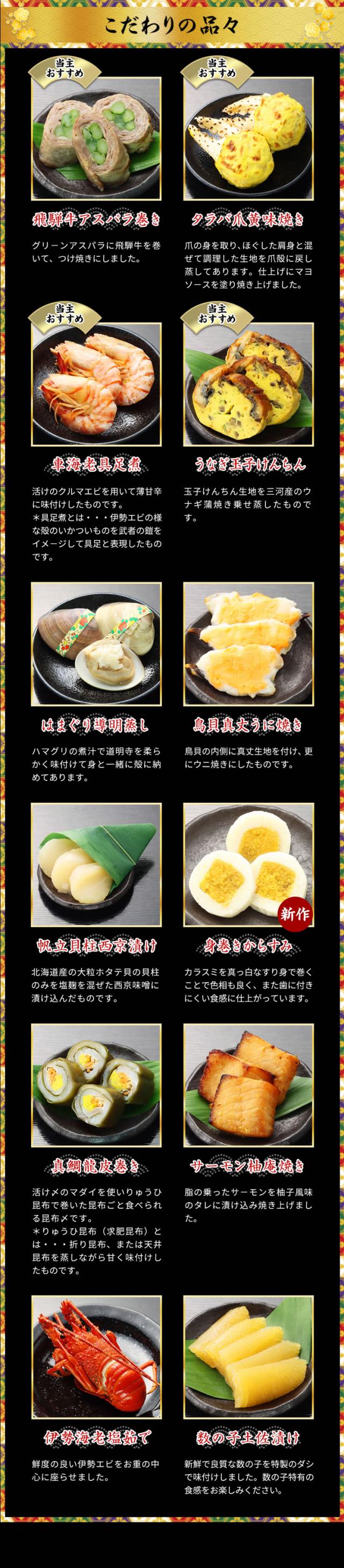 年に一度のお正月を祝うのにふさわしいこの上ないほどのおせち『柳凰』。贅沢を極めた食材は、国産の「伊勢海老」、特大サイズの「アワビ」や「タラバ蟹」をはじめ、「飛騨牛アスパラ巻き」「身巻きカラスミ」など、厳選した高級食材をたっぷり詰め込んでいます。食材の選定から京風の繊細な味付け、華やかな盛り付けまで、全てにこだわり抜いた『柳凰』は、皆様の晴れやかな新年を飾るにふさわしいおせちと自負しております。