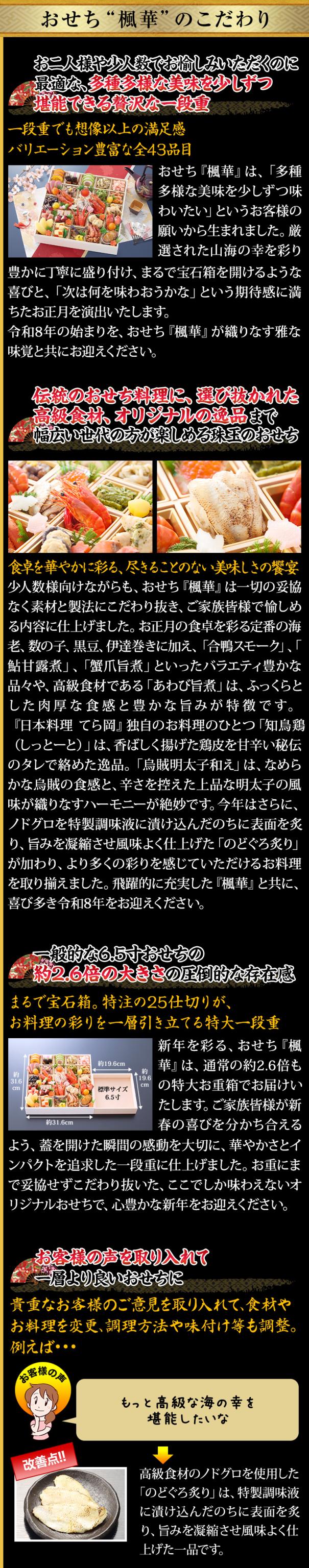 令和8年の『楓華』は、ノドグロを特製調味液に漬け込んだのちに表面を炙った「のどぐろ炙り」が新たに加わり、その他も「知鳥鶏(しっとーと)」や「明太子昆布〆」など『日本料理 てら岡』ならではのオリジナル料理を多数ご用意。ぜひご家族皆様で、この豪華絢爛なおせちをお楽しみください。