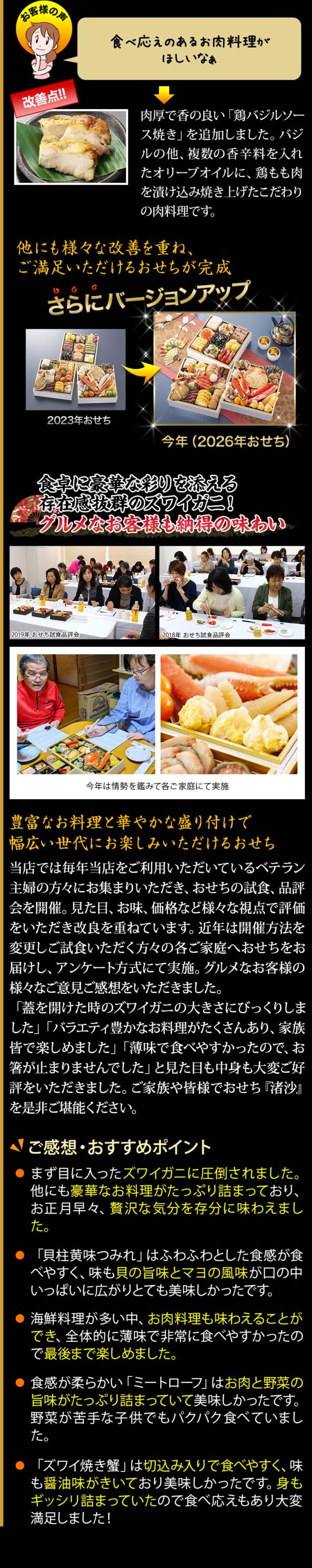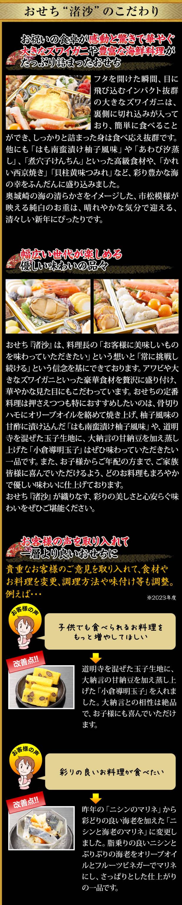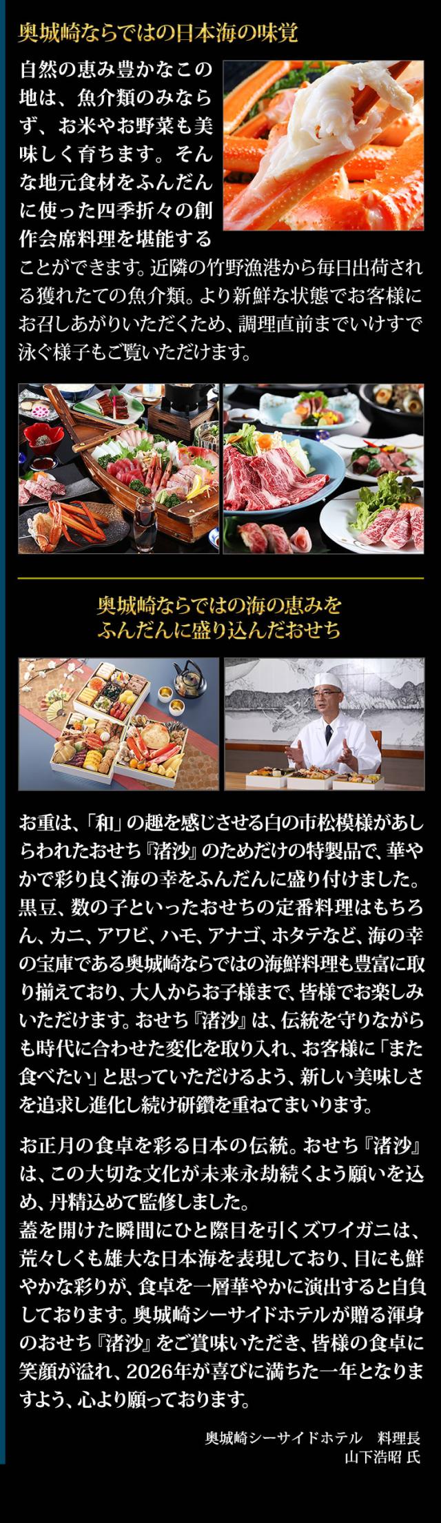黒豆、数の子といったおせちの定番料理はもちろん、カニ、アワビ、ハモ、アナゴ、ホタテなど、海の幸の宝庫である奥城崎ならではの海鮮料理も豊富に取り揃えており、大人からお子様まで、皆様でお楽しみいただけます。おせち『渚沙』は、伝統を守りながらも時代に合わせた変化を取り入れ、お客様に「また食べたい」と思っていただけるよう、新しい美味しさを追求し進化し続け研鑽を重ねてまいります。