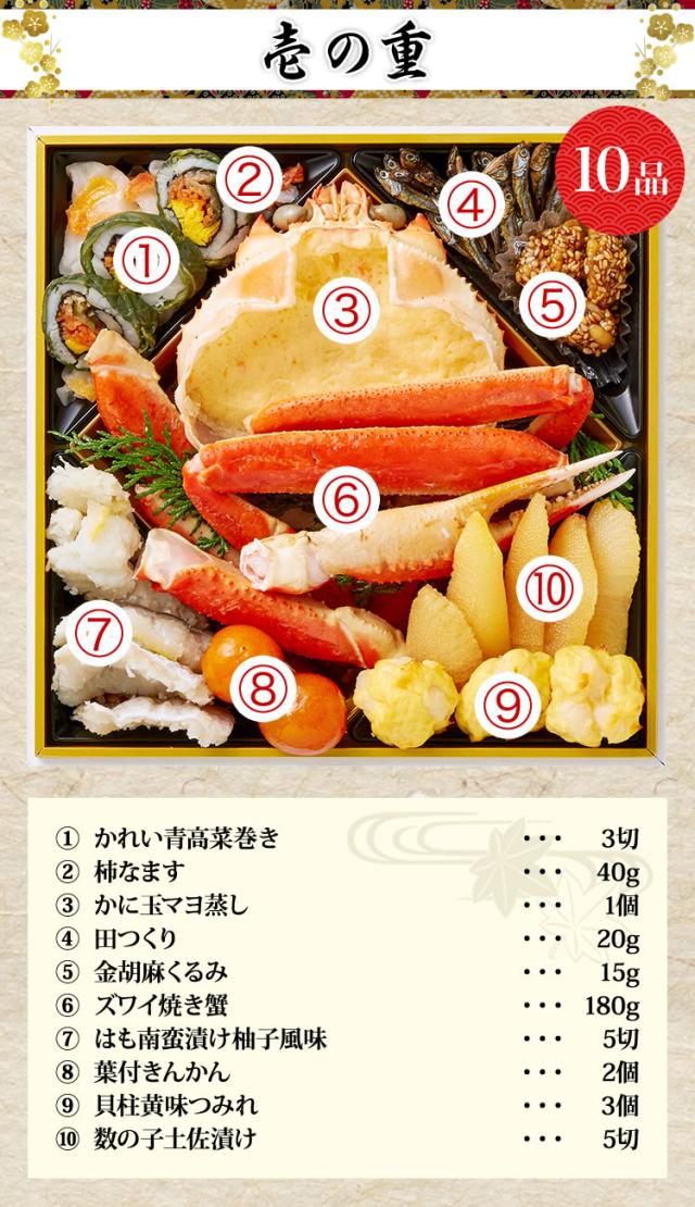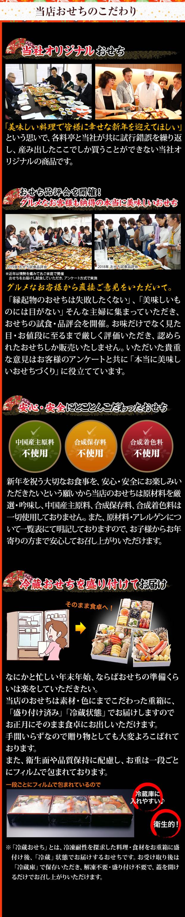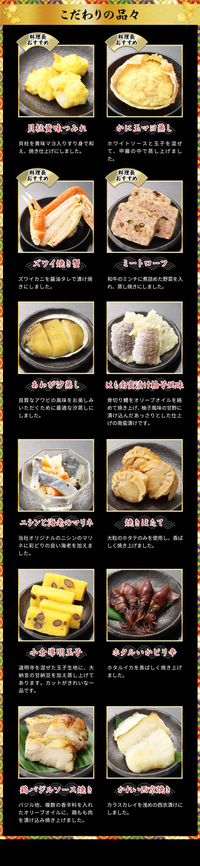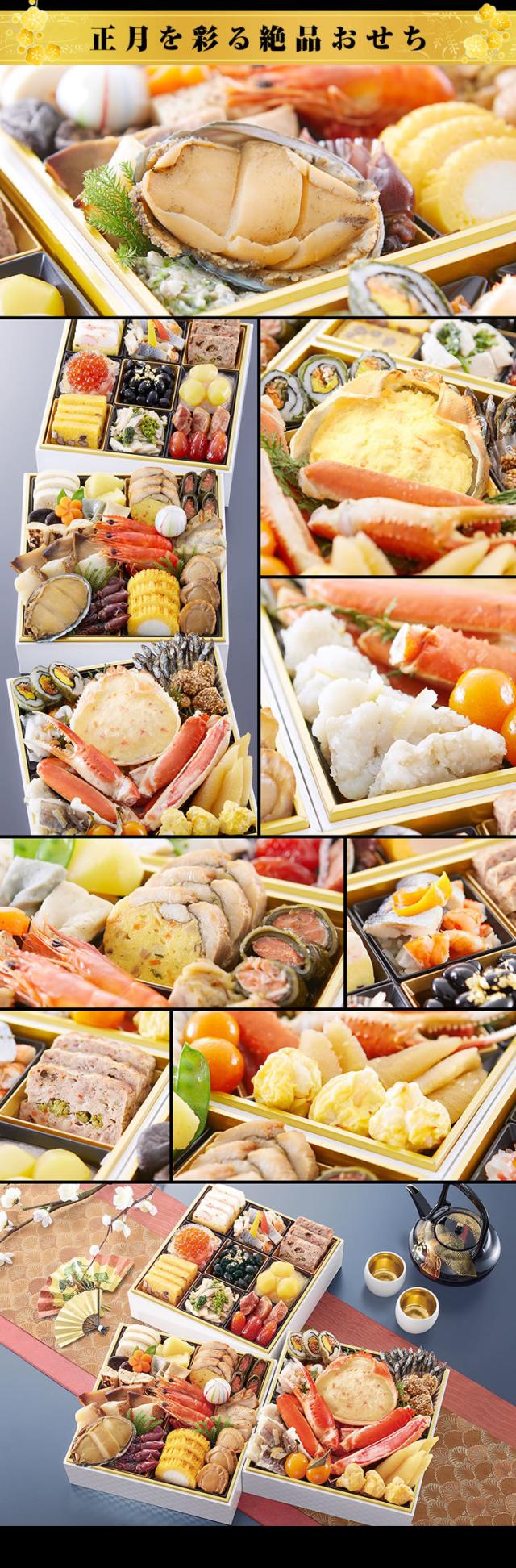 黒豆、数の子といったおせちの定番料理はもちろん、カニ、アワビ、ハモ、アナゴ、ホタテなど、海の幸の宝庫である奥城崎ならではの海鮮料理も豊富に取り揃えており、大人からお子様まで、皆様でお楽しみいただけます。おせち『渚沙』は、伝統を守りながらも時代に合わせた変化を取り入れ、お客様に「また食べたい」と思っていただけるよう、新しい美味しさを追求し進化し続け研鑽を重ねてまいります。