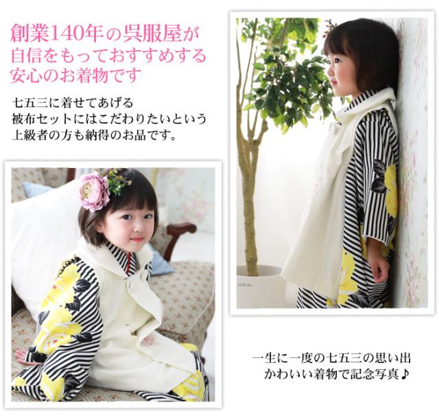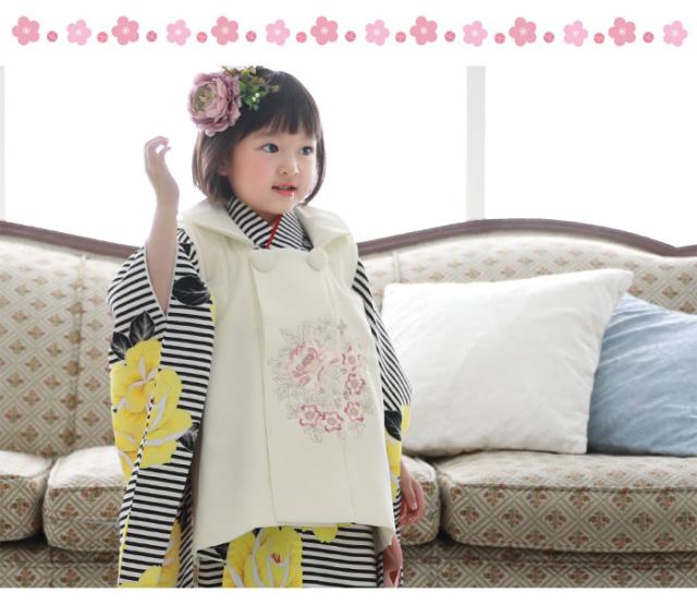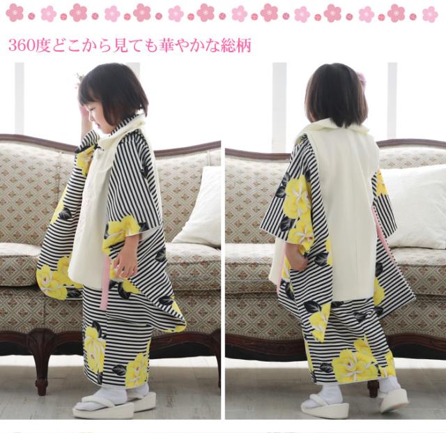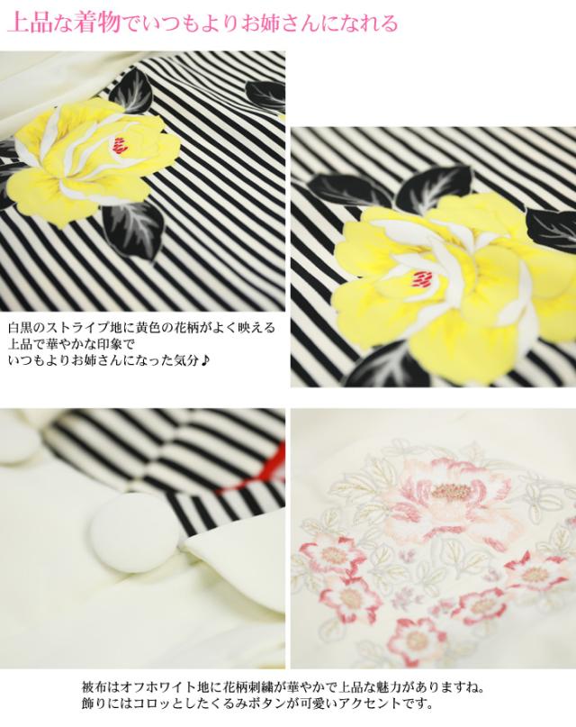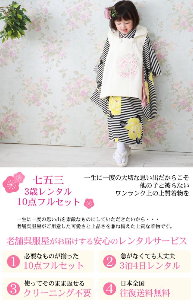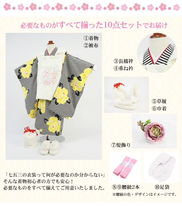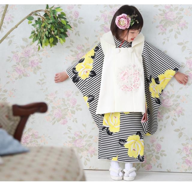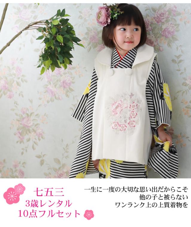 【レンタル】七五三 着物 3歳 レンタル 女の子 被布着物10点セット「白・黒のストライプに黄色の花柄 被布・オフホワイト」着物被布セット モダン 衣装 おしゃれ かわいい