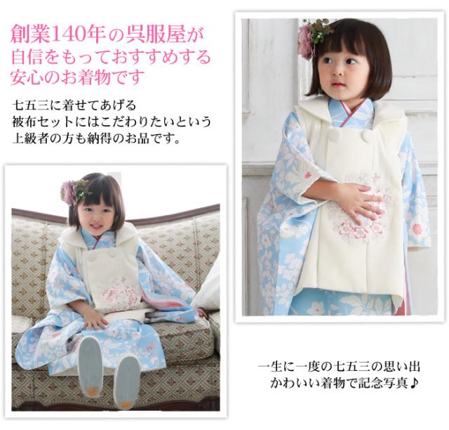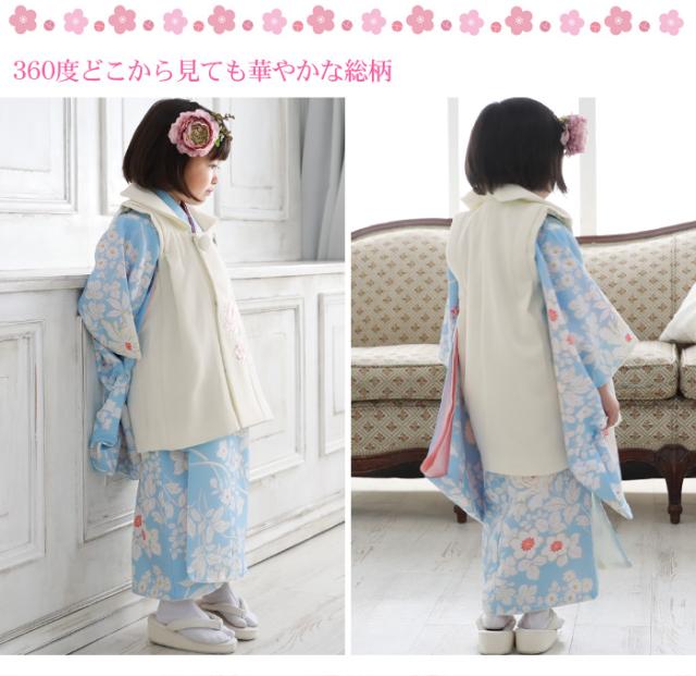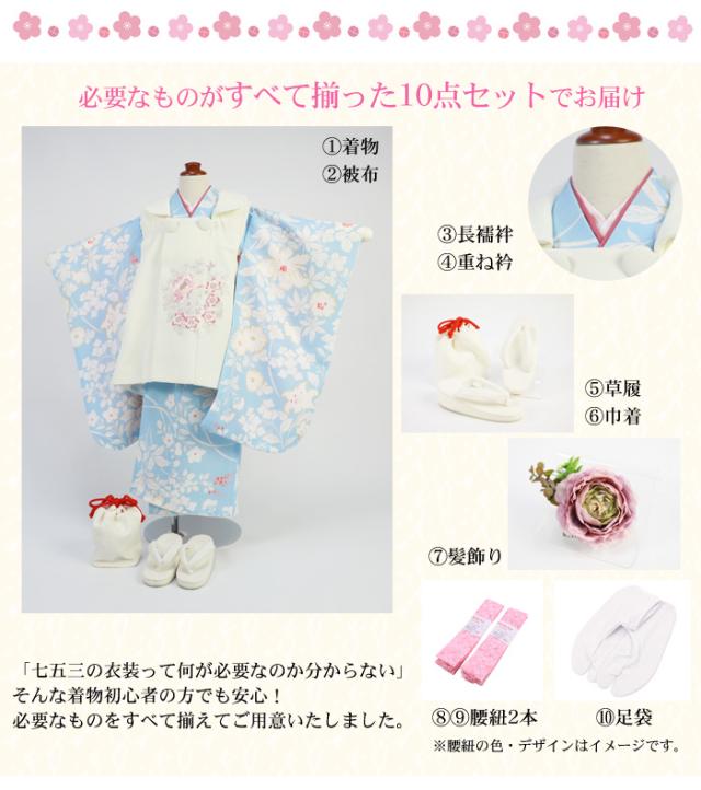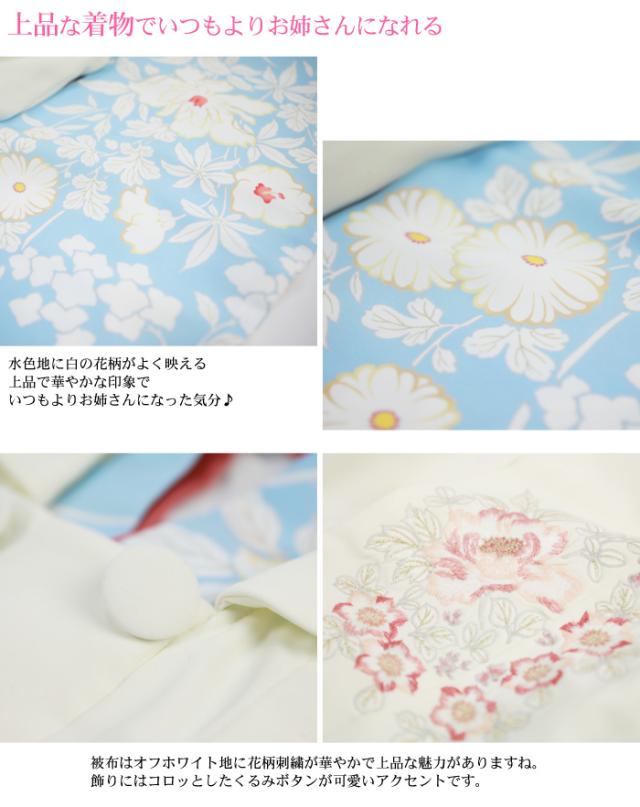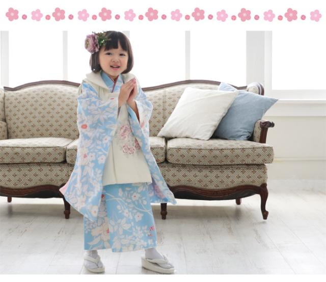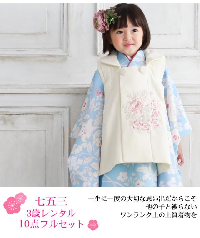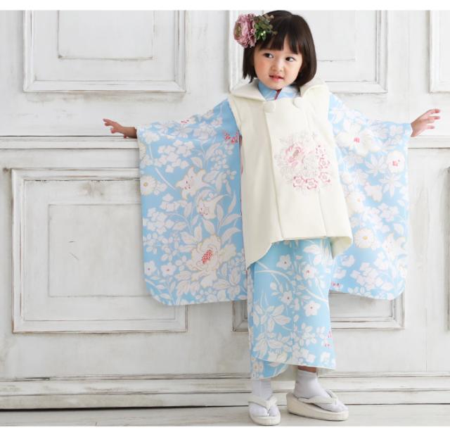 七五三 着物 3歳 レンタル 女の子 被布着物10点セット「水色地に白の花柄 被布・オフホワイト」着物被布セット モダン 衣装 おしゃれ かわいい