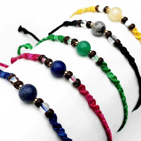 ピンク:ラピスラズリ、水晶、ココナッツ、サトウキビ糸、Waxポリエステルコード 緑:ソーダライト、水晶、ココナッツ、サトウキビ糸、Waxポリエステルコード 青:モスアゲート、水晶、ココナッツ、サトウキビ糸、Waxポリエステルコード 黄:アラゴナイト、シャコ貝、ココナッツ、サトウキビ糸、Waxポリエステルコード New黒:水晶、グレージャスパー、サトウキビ糸、Waxポリエステルコード ピンク×水色:ローズクォーツ、マザーオブパール、サトウキビ糸、Waxポリエステルコード 青×白:ラピスラズリ、マザーオブパール、サトウキビ糸、Waxポリエステルコード オレンジ:ラピスラズリ、水晶、サトウキビ糸、Waxポリエステルコード ベージュ:アマゾナイト、マザーオブパール、サトウキビ糸、Waxポリエステルコード 水色:ラピスラズリ、シャコ貝、サトウキビ糸、Waxポリエステルコード |