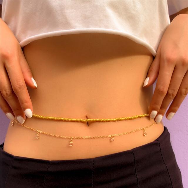 金色ゴールドの細身のチェーンにクリスタルのビジューチャームが揺れるウエストチェーンとゴールドのビーズを通した伸縮性のあるウエストチェーン2本をセットにしたボディチェーン。