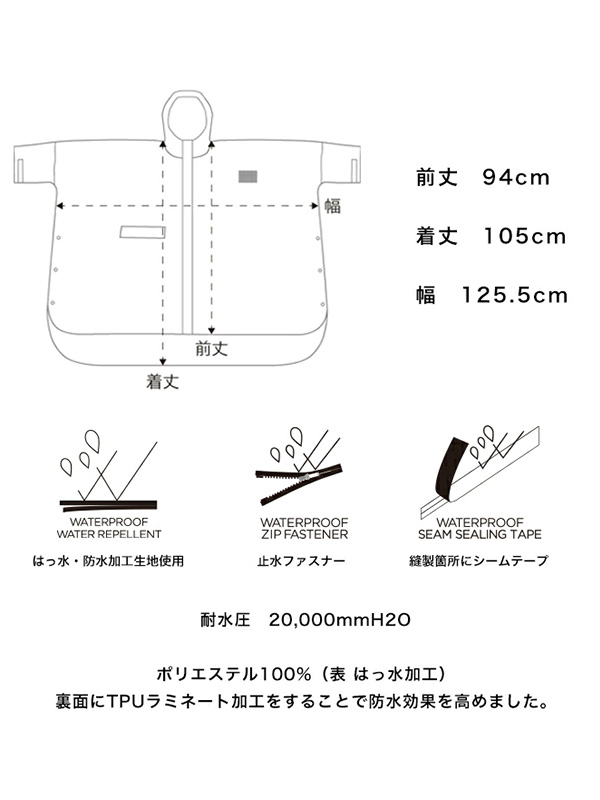 耐水圧 20,000mmH2O 表面:はっ水加工 裏面:TPUラミネート加工(熱可塑性ポリウレタン) 収納袋付き 止水ファスナー 縫製箇所にシームテープ 日本正規販売店 | ||||||||||