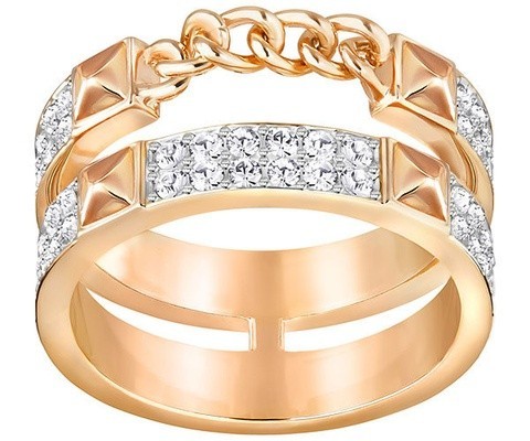 スワロフスキー『Friction リング』です。ロックテイストなエッジを効かせたモダンな輝きのリング。日常のリラックススタイルや夜のエレガントスタイルなどのどんな装いにも最適な、繊細で洗練されたアイテムです。トレンドの重ね付けを意識したユニークなデザインには固定されたチェーンの他、クリアクリスタルやローズゴールドコーティングのスタッズをあしらっています。他のリングとコーディネートして、旬な雰囲気漂う手元を演出しましょう。
