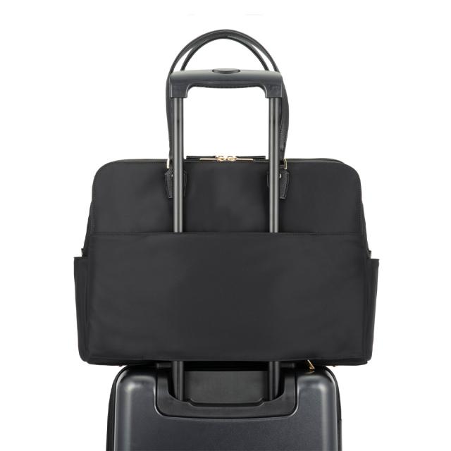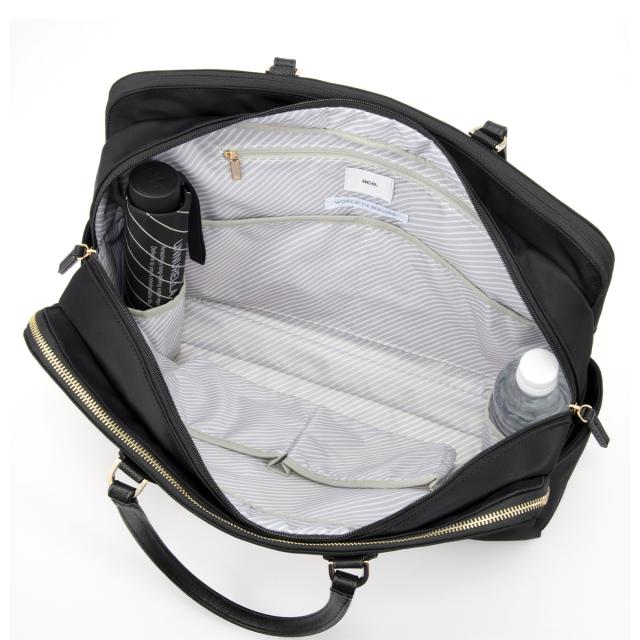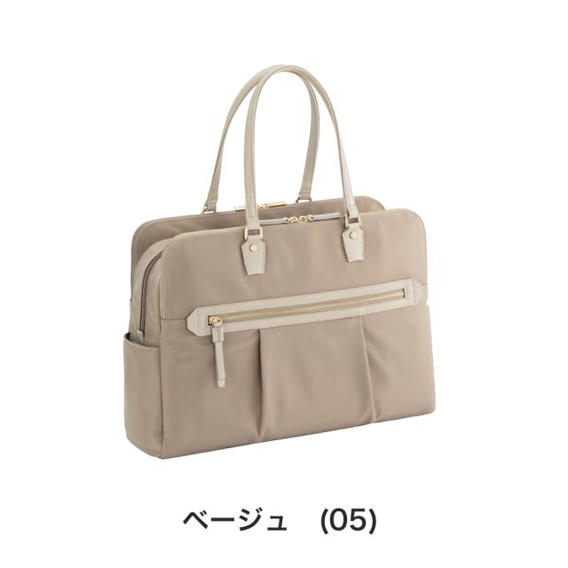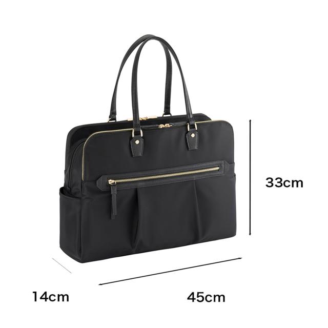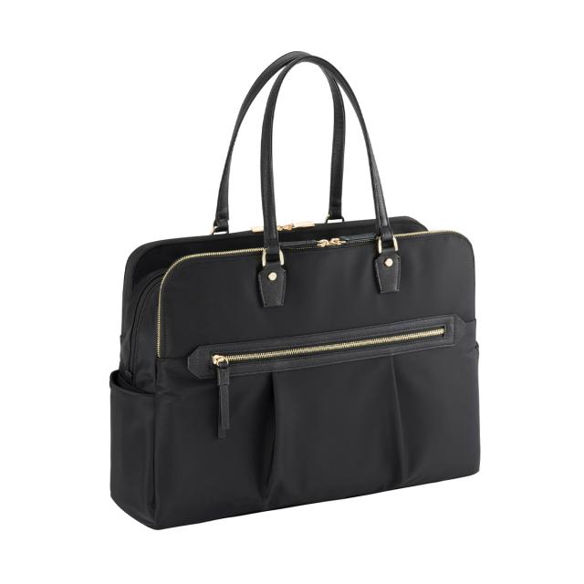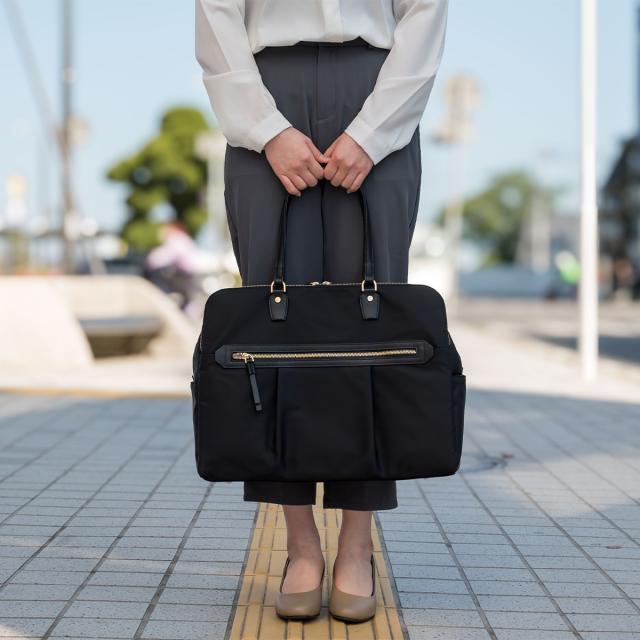 15.6インチのノートPC、B4ファイルが入るサイズ感で、普段持ち歩く荷物が多い方にもおすすめの大容量タイプ。モバイル周辺機器やファイル類、ポーチ、お弁当箱など女性の通勤に必要なアイテムをしっかり収納可能です。
