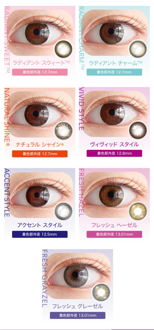 ■カラー:シアードリーム、シアーアリュール、アクセントスタイル、ナチュラルシャイン、ヴィヴィッドスタイル、ラディアントチャーム、ラディアントブライト、ラディアントスウィート、ラディアントシック、フレッシュグレーゼル