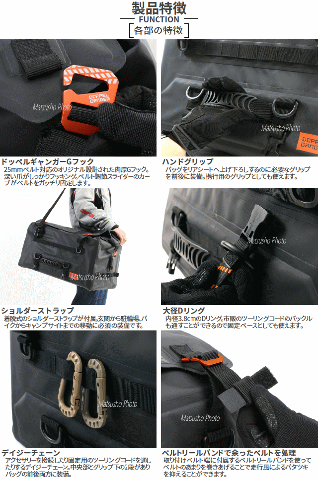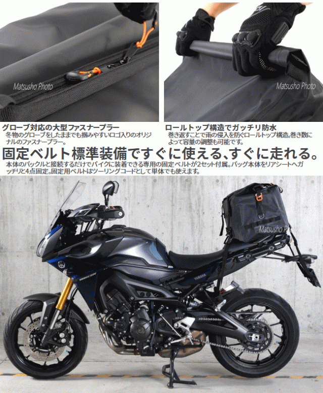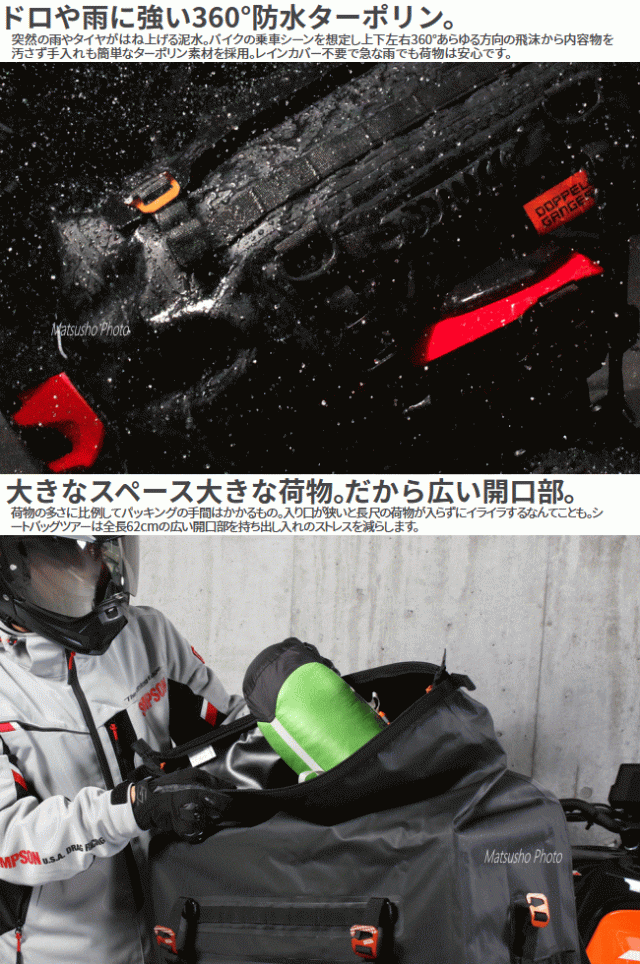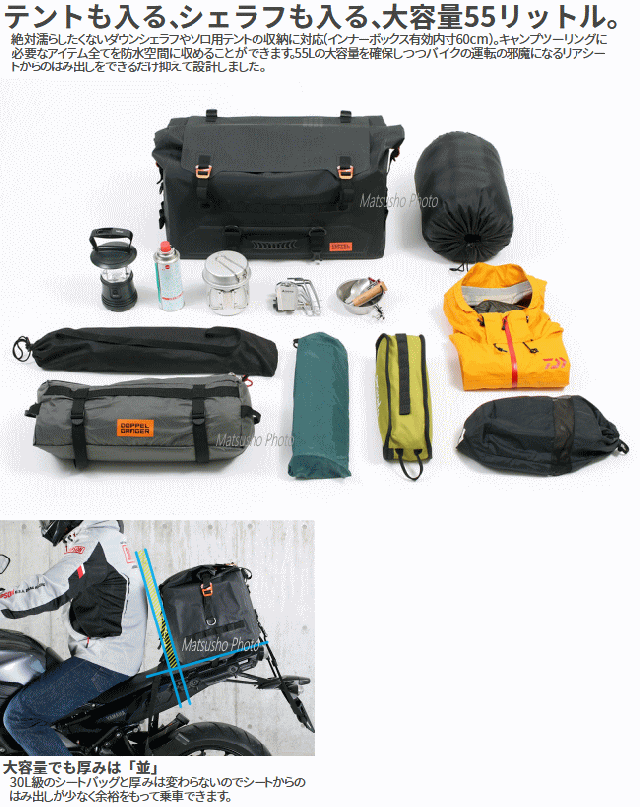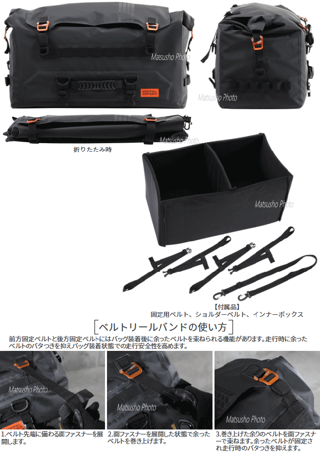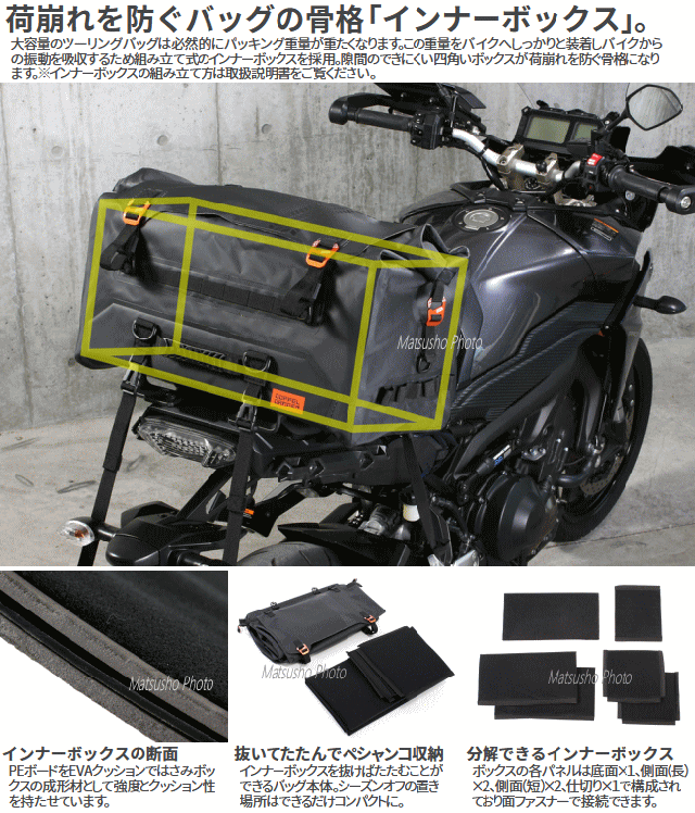 型崩れしない55Lの防水空間。旅コンセプトのシートバッグ「ツアー」。「不便を楽しむのがキャンプ!」そうは言っても道具が不便では辛いばかり。これ1つでソロキャンプの必需品全てが収納できます。ツーリングからお家まであらゆるシーンを考えたレインカバーの要らない防水シートバッグです。■カラー:ブラック■サイズW62×L(D)32×H36cm■製品総重量(付属品含む)3.75kg■容量55L■最大積載重量15kg■材質:ターポリン■付属品:固定用ベルト×2SET、ショルダーベルト×1、インナーボックス×1■原産国:中国※過積載や片寄った積み方はしないで下さい。走行前点検時に各部取り付け箇所の緩みがないか確認して下さい。車体の形状によっては適切に固定できない場合があります。本製品は防水加工を施しておりますが完全防水仕様ではありません。雨天時での長時間の使用や雨量などによって浸水する場合があります。