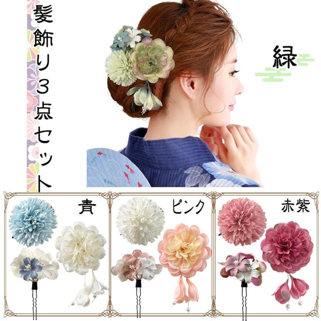 髪飾り 3点セット 房付きダリア ピンポンマム 花のUピン 成人式 卒業式 結婚式 浴衣にも