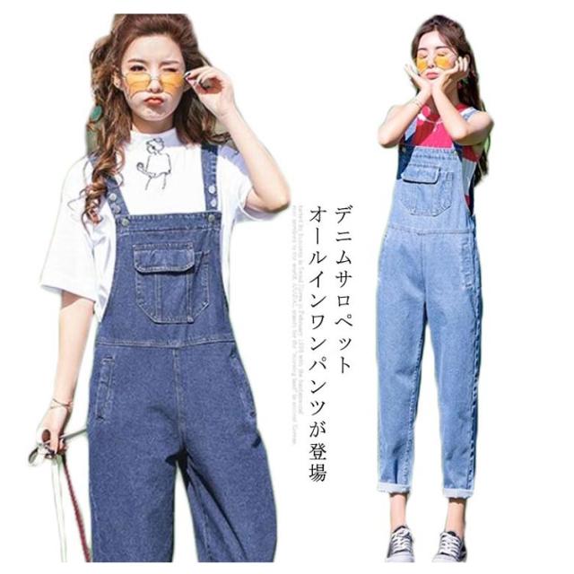 送料無料 サロペット レディース ブルーデニムサロペット オールインワン 大人可愛い ゆったり サルエルパンツ デニム オーバーオール ワイド ロング カジュアル デニム きれいめ ゆったり目