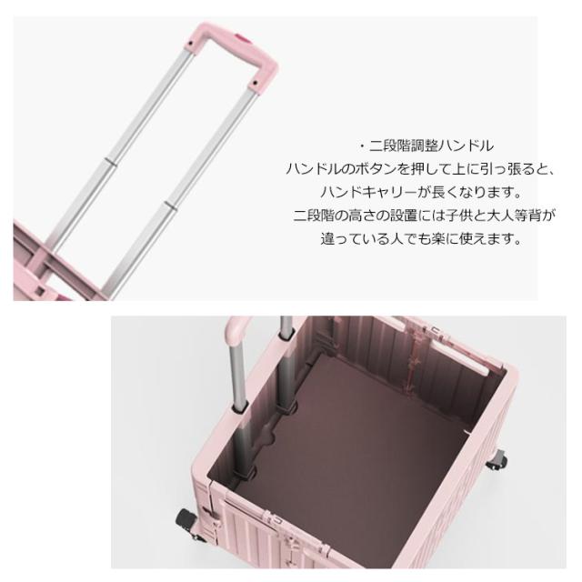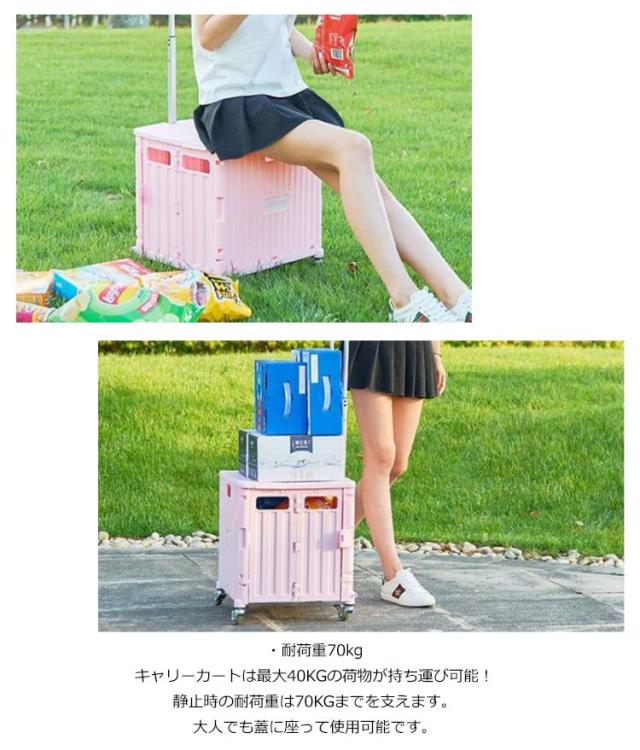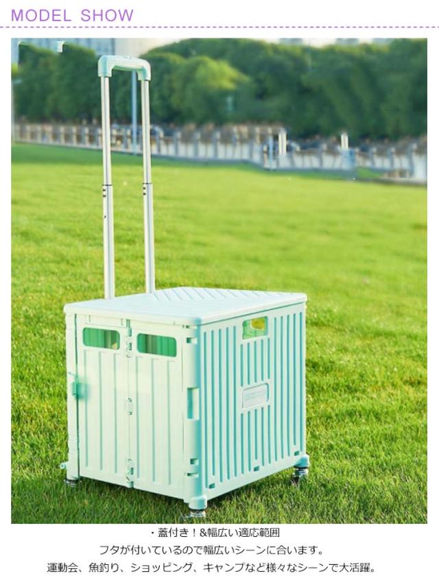 | ・二段階調整ハンドル ハンドルのボタンを押して上に引っ張ると、ハンドキャリーが長くなります。 二段階の高さの設置には子供と大人等背が違っている人でも楽に使えます。 ・耐荷重70kg キャリーカートは最大40KGの荷物が持ち運び可能! 静止時の耐荷重は70KGまでを支えます。 大人でも蓋に座って使用可能です。 ・360度回る車輪&ブレーキ付き キャリーカートは360度回る車輪を4つ付属。 普通の車輪より曲がりやすいので、重たいものを運ぶのが便利です。 ブレーキのロックを固定して、少しの間にフタに腰掛けても大丈夫です。 4つの車輪は全て静音タイヤを使用してるので、室内使用にも便利です。 ・蓋付き!&幅広い適応範囲 フタが付いているので幅広いシーンに合います。 運動会、魚釣り、ショッピング、キャンプなど様々なシーンで大活躍。 ・コンパクトに収納&持ち運び便利 使わないときは折りたたんでコンパクトに収納できます。 畳むとコンパクトで、保管場所も省スペースでOK。 重量3.2kgで、女性でも楽に運べる軽量設計です。 | |