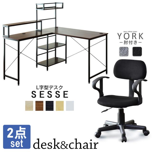 パソコンデスク デスク PCデスク L字型 コーナー ラック付き 木製 勉強机 書斎机 オフィスチェア メッシュ コンパクト チェア パソコンチェア セス ヨーク肘付き