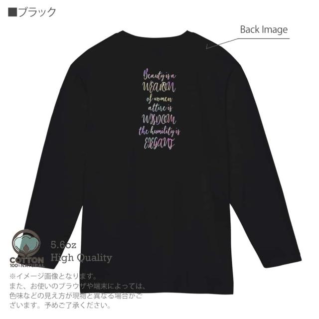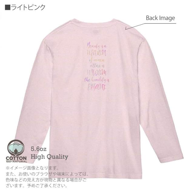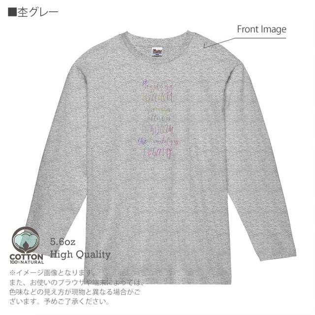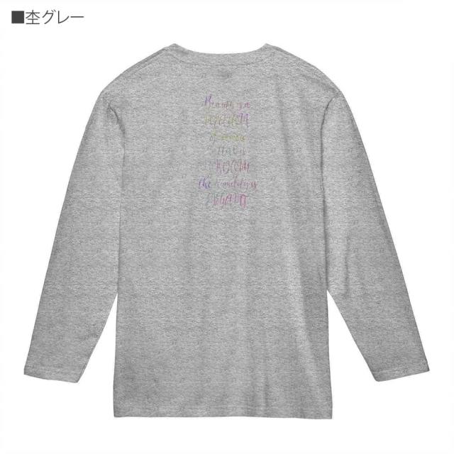 | 素 材 | ・長袖Tシャツ5.6oz ・綿(コットン)100%(※杢グレーは綿80%、ポリエステル20%) ・商品の出荷時は、プリント時に使用した糊が付着しております(印刷面の周りなど)。一度洗濯してからご着用下さいませ(何度か洗っているうちに糊は取れます)。 |