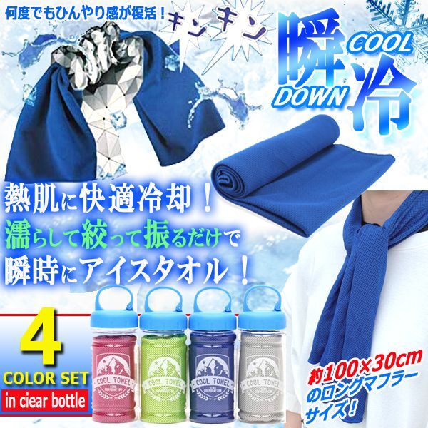 濡らして振るだけで何度でも瞬冷!ボトル入りクールタオル4色セット (涼しい COOL ロングマフラーサイズ 首に巻ける クーリッシュ)