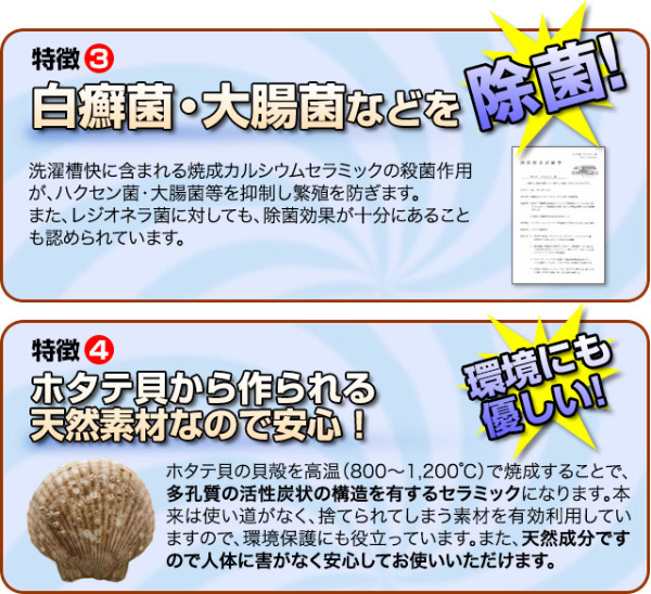 ※ネットは付属しません!ホタテの貝からつくる焼成カルシウムの持つ除菌力でカビを抑制すると共に、洗濯槽に付着している黒カビを徐々に除去します。白癬菌・大腸菌等の抑制と繁殖を防ぎます。なま乾き・部屋干し等で発生するイヤな臭いを抑えます。排水管・排水溝のヌメリや悪臭が徐々に取れていきます。成分は食品衛生法食品添加物同等品。(弱アルカリ性)
