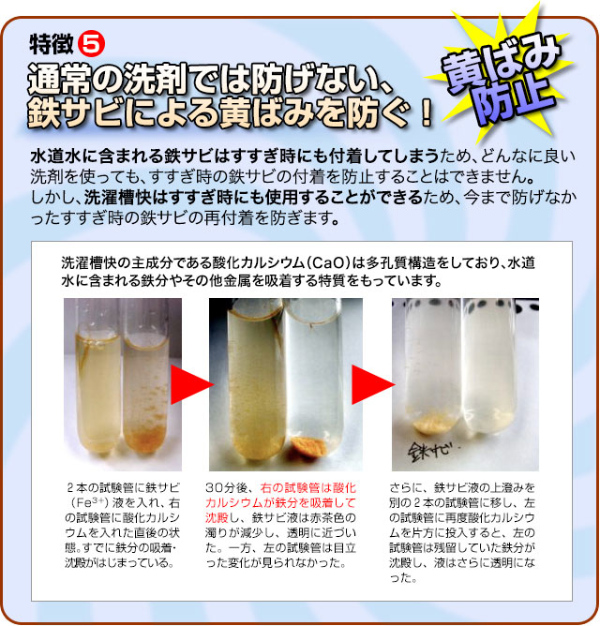 | 使用上のご注意 | ●安全のため、お子様の手が届かない所に保管してください。 ●漂白効果はありません。又、塩素系漂白剤とのご使用も効果はありません。 ●本来の目的以外のご使用で事故が発生した場合、責任を負いかねますのでご了承ください。 |