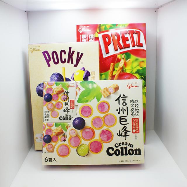 信州長野限定の人気のグリコのお菓子 信州りんごプリッツ、巨峰ポッキー、巨峰クリームコロンセット