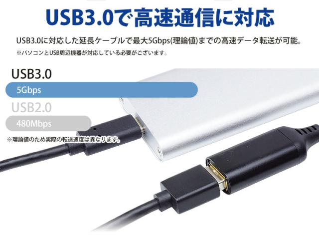 USB3.0に対応した延長ケーブルで最大5Gbps(理論値)までの高速データ転送が可能。