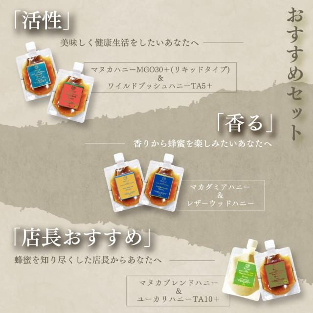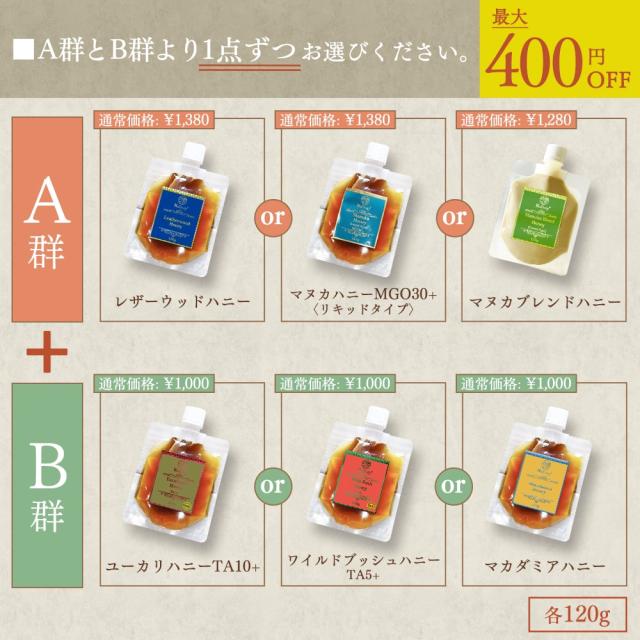 【B群】ユーカリハニーTA10+、ワイルドブッシュハニーTA5+、マカダミアハニー(A群、B群より1つずつお選びください。)
