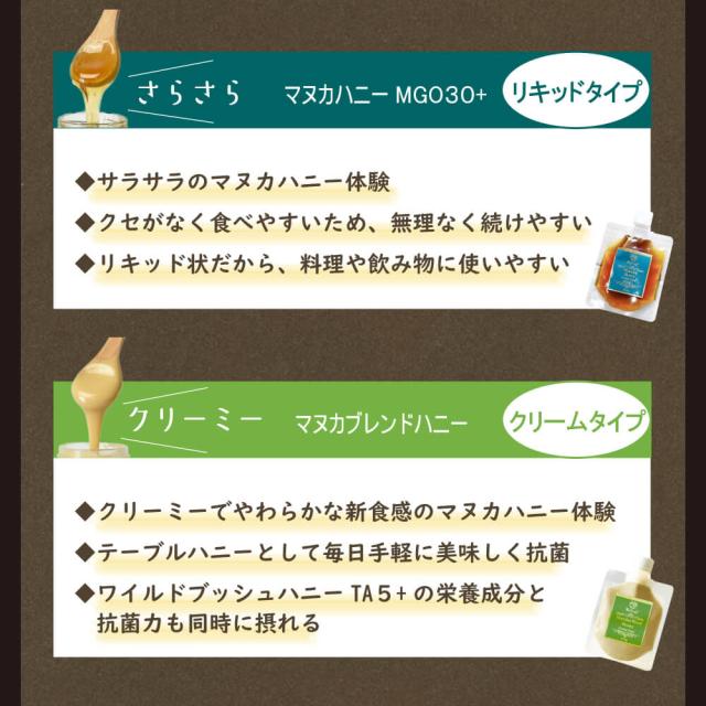 [名称]【A群】レザーウッドハニー、マヌカハニーMGO30+リキッドタイプ、マヌカブレンドハニークリームタイプ