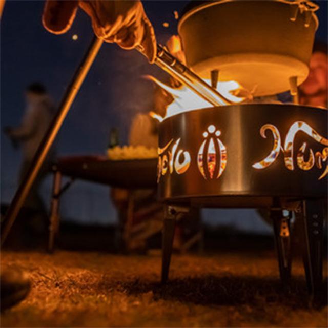 大型の焚火台兼屋外調理器として、4名以上でも周りを囲んで食事や団らんを楽しめます。