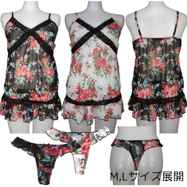 ベビードール&Tバックショーツセット ベビードール Tバック ショーツ セット 花柄 キュート シフォン 透け M L セクシー ランジェリー 女性 レディース メール便送料無料