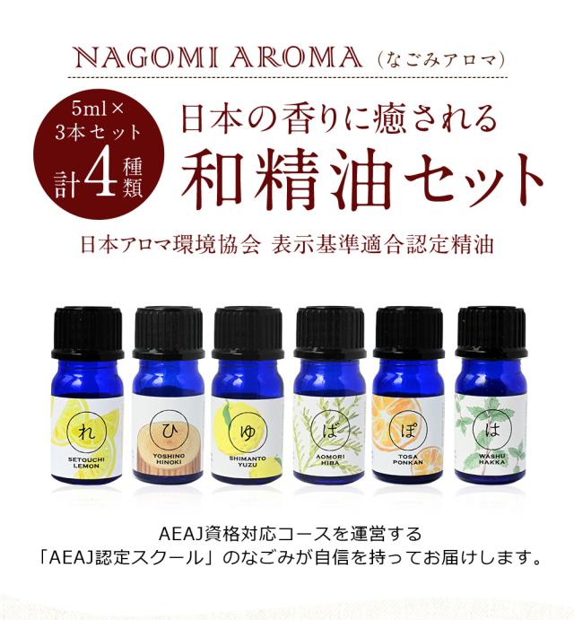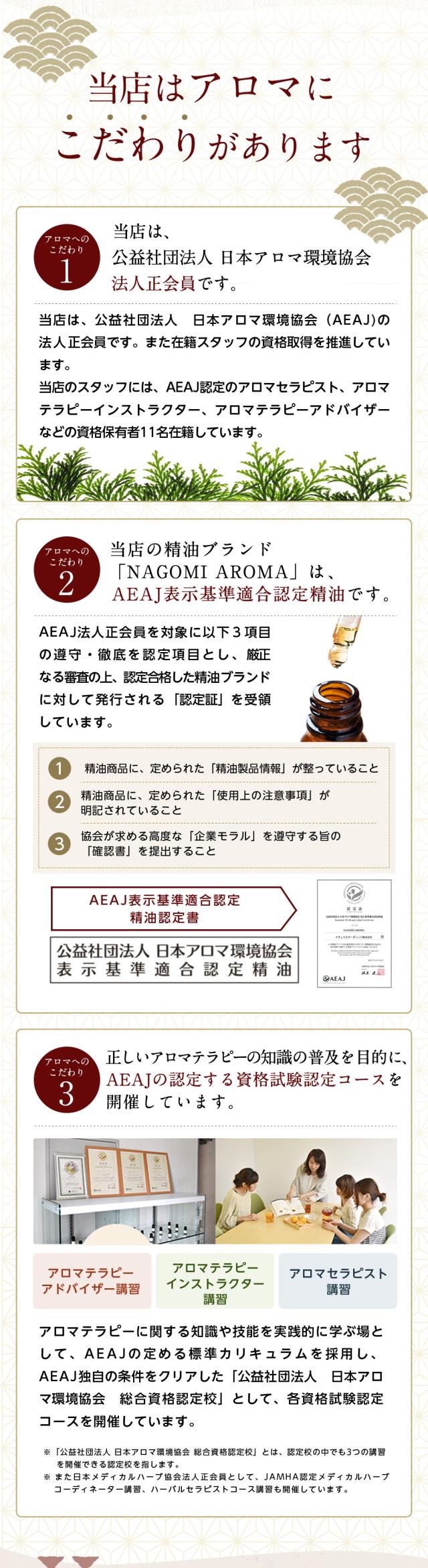 当店のエッセンシャルオイル「NAGOMI AROMA」は、公益社団法人日本アロマ環境協会表示基準適合認定精油です。