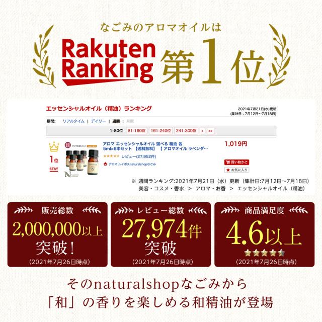 【特徴】NAGOMI AROMAシリーズ商品はすべて、合成香料などを添加していない100%ピュアなエッセンシャルオイルです。芳香浴や自分だけのオリジナルブレンドを作ってみたりと楽しみ方はいろいろ。この機会にぜひお試しください。