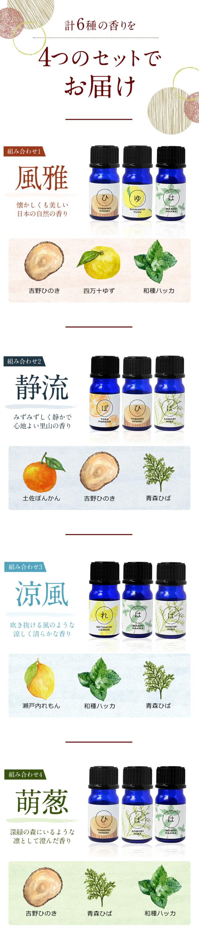 | アロマ エッセンシャルオイル 選べる6本セット 各5ml 1,019円 | アロマ エッセンシャルオイル 選べる8本セット 各10ml 2,680円 |