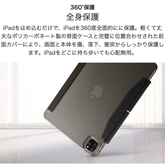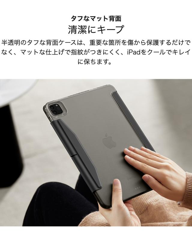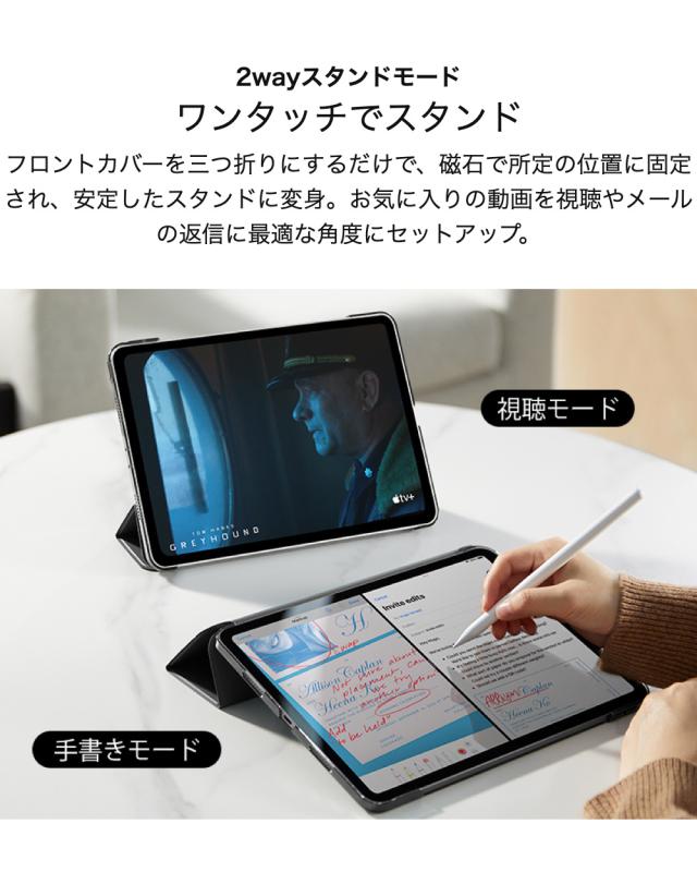 【全面的保護】フロントカバーと半透明ケースが、スリムさと軽量さを保ちつつ、iPadを日常生活の衝撃や傷から保護します。【スマートカバー】オートスリープ/ウェイク機能が毎回素早く作動します。三つ折り磁気カバーは鑑賞モードとタイピングモードの両方に対応しています。【APPLE PENCIL対応】側面の特別な切り欠きにより、Apple Pencil 2の磁気アタッチメントやワイヤレス充電といった新機能に対応しています。【機能的な留め具】Apple Pencilを取り付けていてもいなくても、iPadをしっかりとカバーして保護できるように特別に設計されています。●[iPad 第11/10世代はペン収納の留め具(カバー)はありません。