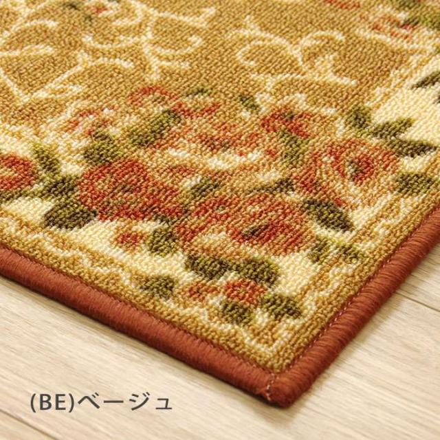 ナイロンキッチンマット。44x120cmサイズ。カラーは、ベージュ(4956642415855:5418819)、ブラウン(4956642415985:5419019)、グリーン(4956642750789:5421719)、です。絵羽柄のカーペットです。表地には撥水加工を施しておりますので、汚れにくくお手入れも簡単です。表地のパイル部分にはナイロンを使用しています。ナイロンは強度や摩耗に強く、速乾性があり、また遊び毛も出にくいなどの特徴があります。季節を選ばず、オールシーズンご使用頂けます。同柄のラグサイズ・敷き詰めサイズも取扱いがありますので、トータルでのコーディネートもお勧めです。フローリングを傷つけにくいよう、裏には不織布を貼っております。※キッチンマットサイズのみ滑りにくい加工を施しています。