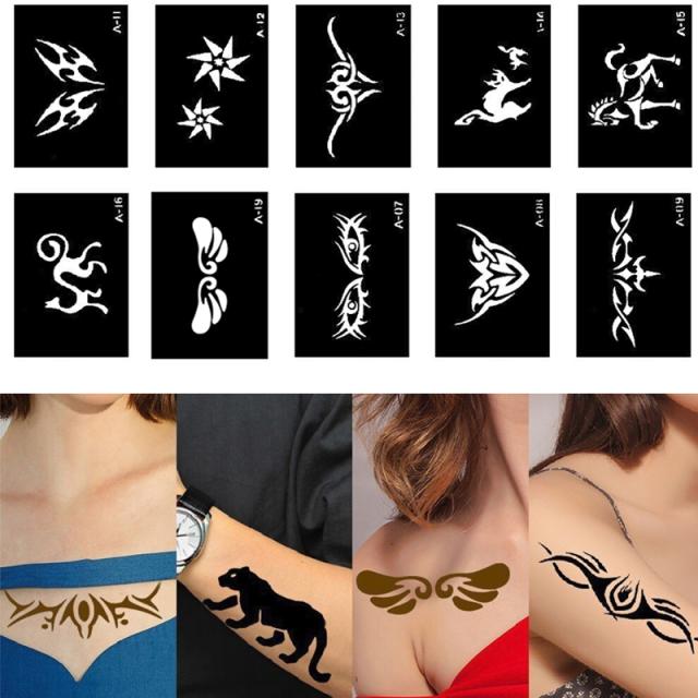 顔や手や足、背中やお腹、胸やおへそ、足首や太腿などいろいろな場所にフェイクタトゥーを簡単に描けるヘナタトゥー用のステンシルシートステッカーです。