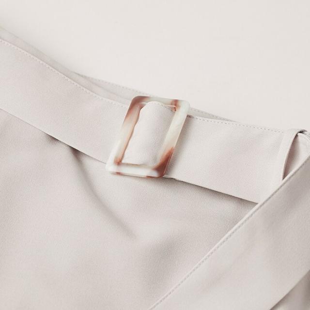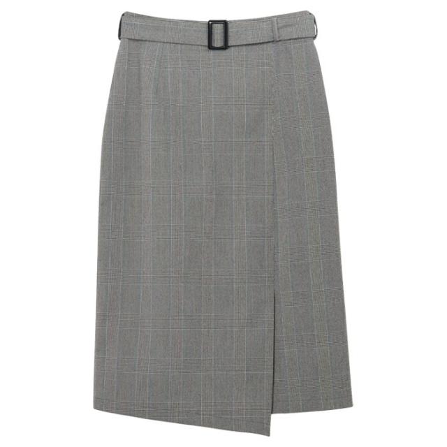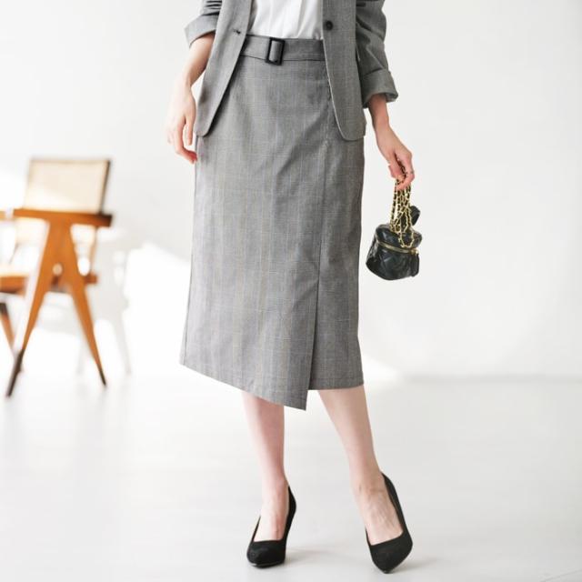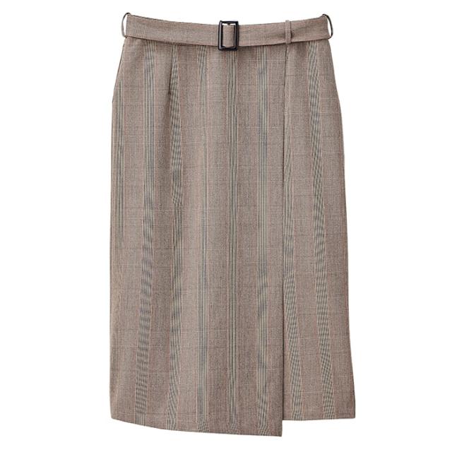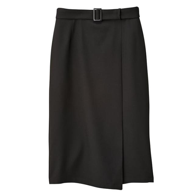ラップ風デザインのスカートは、バックル付ベルトでウエストマークすれば、ノージャケットでもおしゃれに。