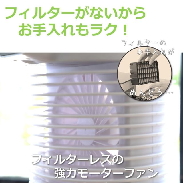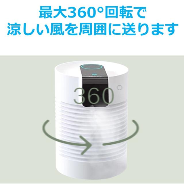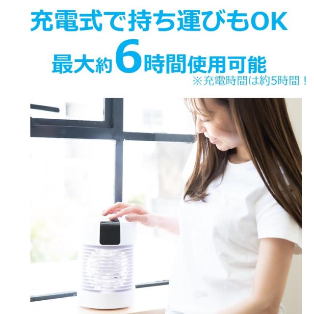 USBで動く冷風扇2021年バージョン!水の気化熱で冷やす卓上エアコン!マイクーラー!超音波加湿器の技術を応用し、ミストをファンで送風する新システム!フィルターレスでお手入れもラクラク♪更に!充電式で最長約6時間、電源なしで使用可能!卓上サイズで持ち運びも便利です!【接続次第で使い方広がる!】パソコンやUSB機器につないで、オフィスやデスクでパーソナルに使ってもOK!携帯型充電池につないで屋外のBBQやアウトドア、レジャーやキャンプなど持ち運びで使ってもOK!運動会や体育祭などでも活躍します♪充電器(ACアダプター)とつなげばコンセントでも使えるので、ご高齢の方やお子様など、エアコンが苦手な方にもお使いいただけます。更に、ミストの力でひんやり効果がパワーアップ!涼しい風をお届けします!【機能】風量は3段階、強・中・弱が選べます。【使い方】タンクに水を入れてスイッチを入れるだけ。水を吸ったフィルターに扇風機の風を送ることで、空気が水で冷却され、気化熱効果で涼しい風となります。重さ:1kg
