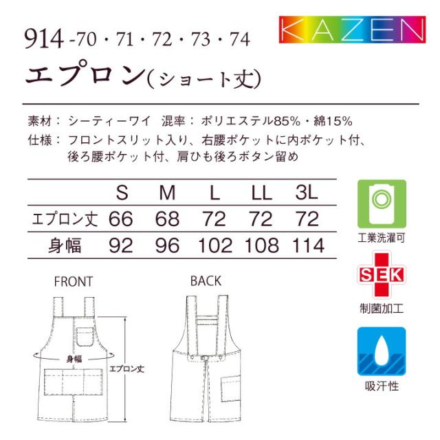 KAZEN 多機能ポケット付き、フロントスリット入りのショート丈 工業洗濯可 SEK制菌加工 吸汗速乾 男性 女性 ユニセックス 914-70 914-71 914-72 914-73 914-74
