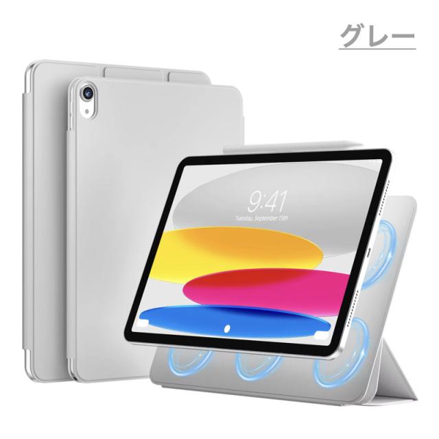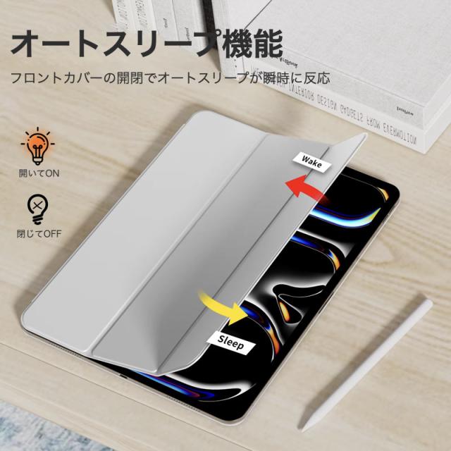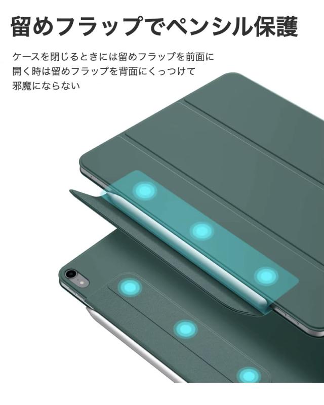 【マグネット吸着】内蔵された多数のマグネットが、カバーとiPadをしっかり密着させ安定感抜群です。【Apple Pencil 2 対応】オープンサイドデザイン(iPad側面が覆われていない)により、Apple PencilのiPadへのペアリングとワイヤレス充電機能に対応しています。【視聴&タイピング 2段階スタンド】三つ折りフロントカバーにより、映画の視聴とキーボード入力に合わせた2通りのスタンド角度を調整できます。【反応抜群 オートスリープ/ウェイクアップ】強力なマグネットにより、オートスリープ/ウェイクアップ機能がしっかり素早く動作します。注意●タッチペンは付属しません。