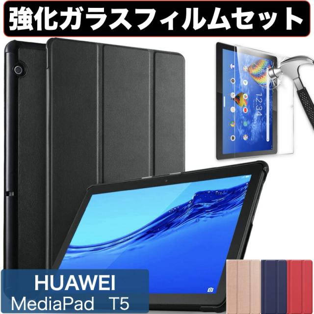 Huawei MediaPad ケース T5 10.1 AGS2-W09 Huawei ファーウェイ カバー 強化ガラスフィルム付き 保護フィルム 9H表面硬度 クリア
