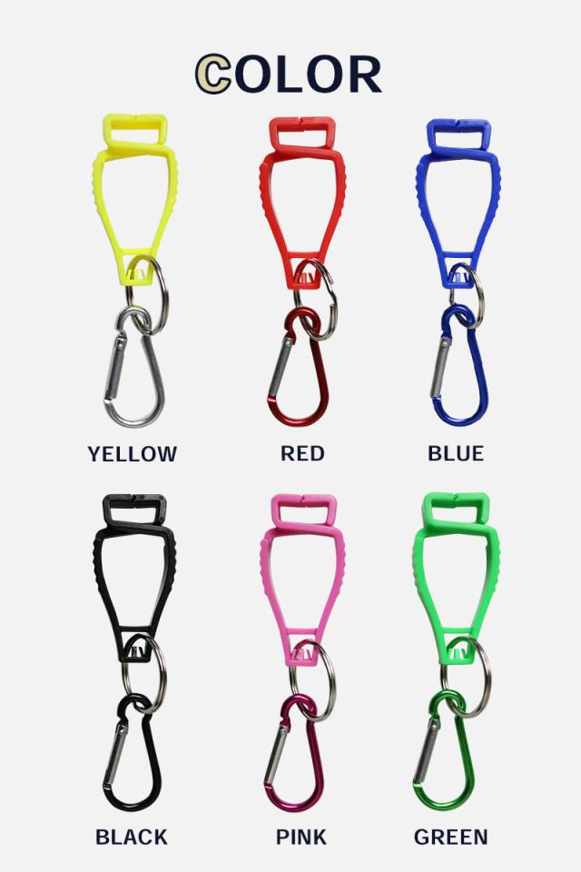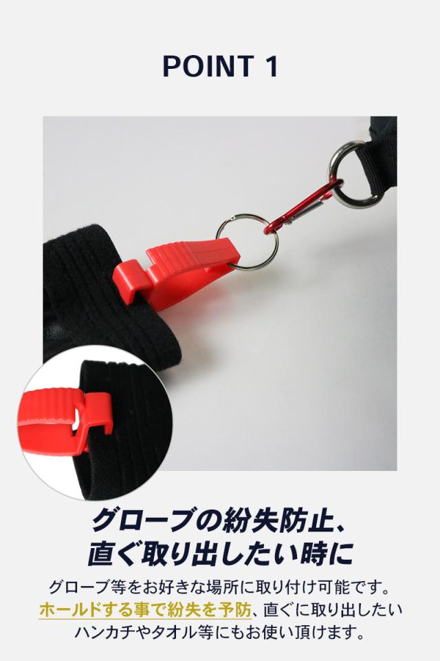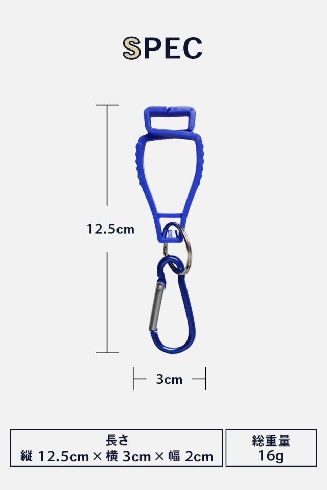 カラビナをベルトやバッグに取り付け、グローブを挟んで運ぶことができるグローブホルダーです。