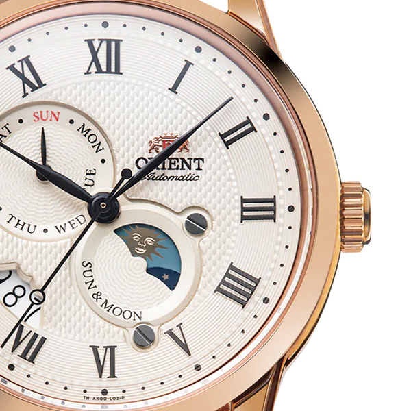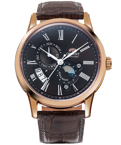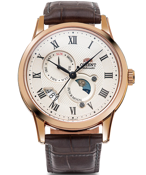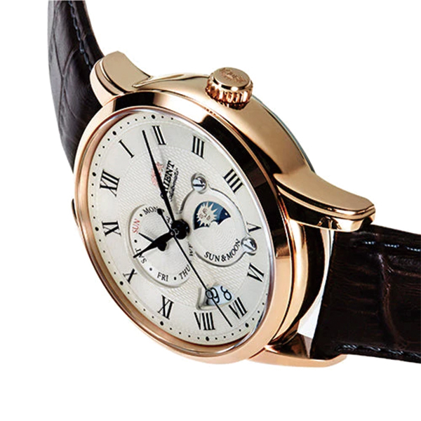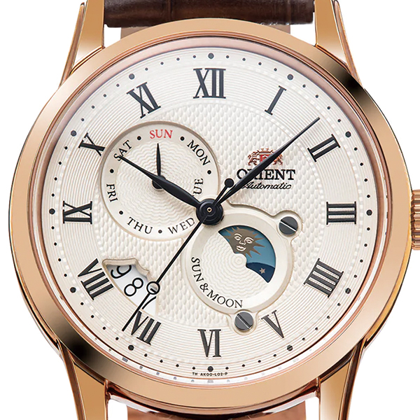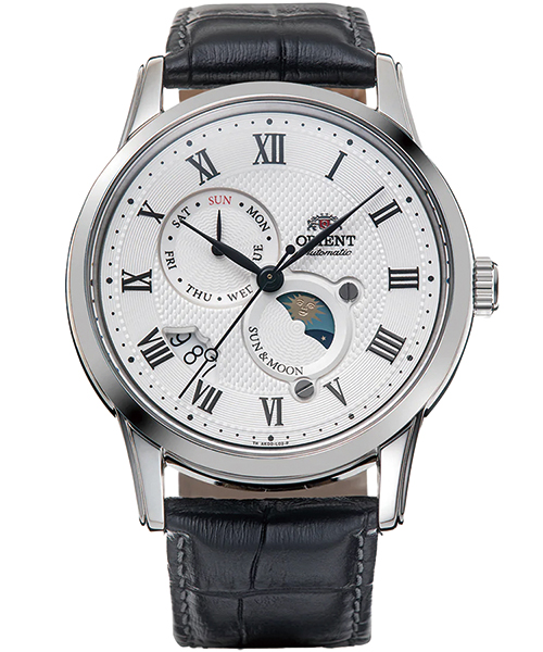 「オリエント」のクラシックシリーズから、これまでの自動巻きのみではなく手巻き機能や秒針停止機能を付けたサン&ムーン表示機構付ウオッチが登場です。