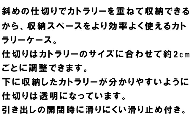 斜めの仕切りでカトラリーを重ねて収納できるから、収納スペースをより効率よく使えるカトラリーケース。 |