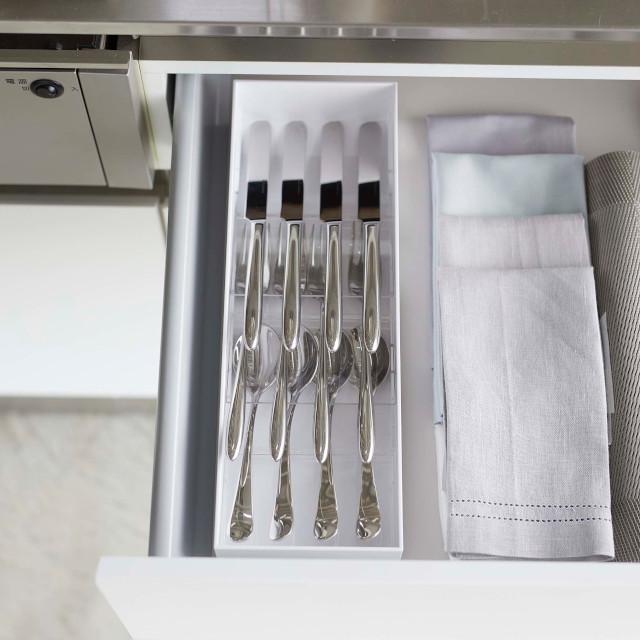 斜めの仕切りでカトラリーを重ねて収納できるから、収納スペースをより効率よく使えるカトラリーケース。