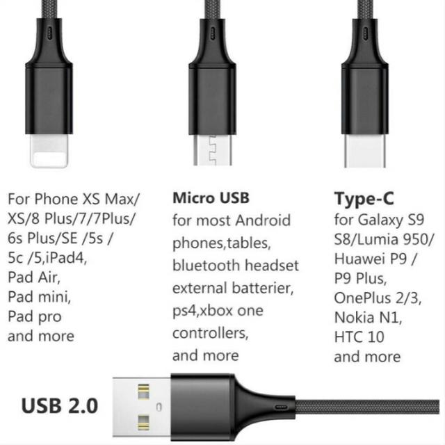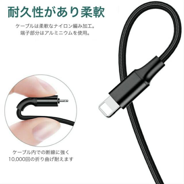 ●簡単充電これ1本で3つの端子に対応し充電。絡まないので、持ち運びに便利!※データ転送はできません。●機能1コネクタ充電で最大出力2A●素材コード部分はねじれや折れに強く、断線しにくいナイロン編みを採用。●ケーブルの長さ全長1.2 m(120 cm)▼ 対応機種●iPhone/iPad/iPod●Micro(Androidスマートフォンなど)●Type-C(Xperia XZ1/ Google Pixel3/ Huawei P20など)※PD未対応です。保証期間 ●1週間注意 ●本製品を使用中にデータの損失、破損が生じた場合の保証は致し兼ねますので予めご了承ください。●本製品を使用した事による、直接的もしくは間接的に生じた損害・破損(データを含む)については弊社では責任を負いかねます。