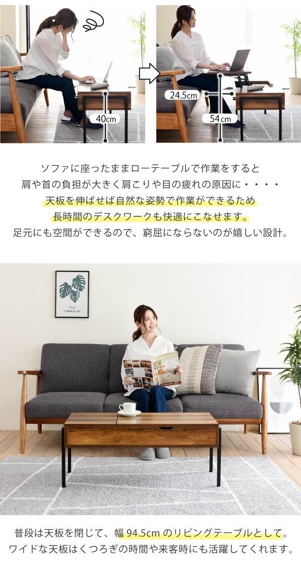 昇降式テーブル リフティングテーブル インダストリアル 幅94.5 高さ40から54 テレワーク センターテーブル ローテーブル リフトアップテーブル ブラック elvis