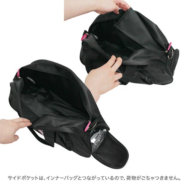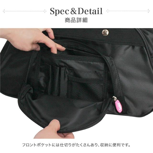 仕切りがたくさんついたフロントポケットと、飲み物を取り出しやすいサイドポケットがついているので、すっきりと収納することができます。