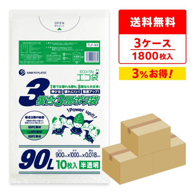 【まとめて3ケース】TLF-93-3 複合3層ポリ袋 90リットル0.018mm 半透明 10枚x60冊x3箱 / ゴミ袋 ごみ袋 送料無料